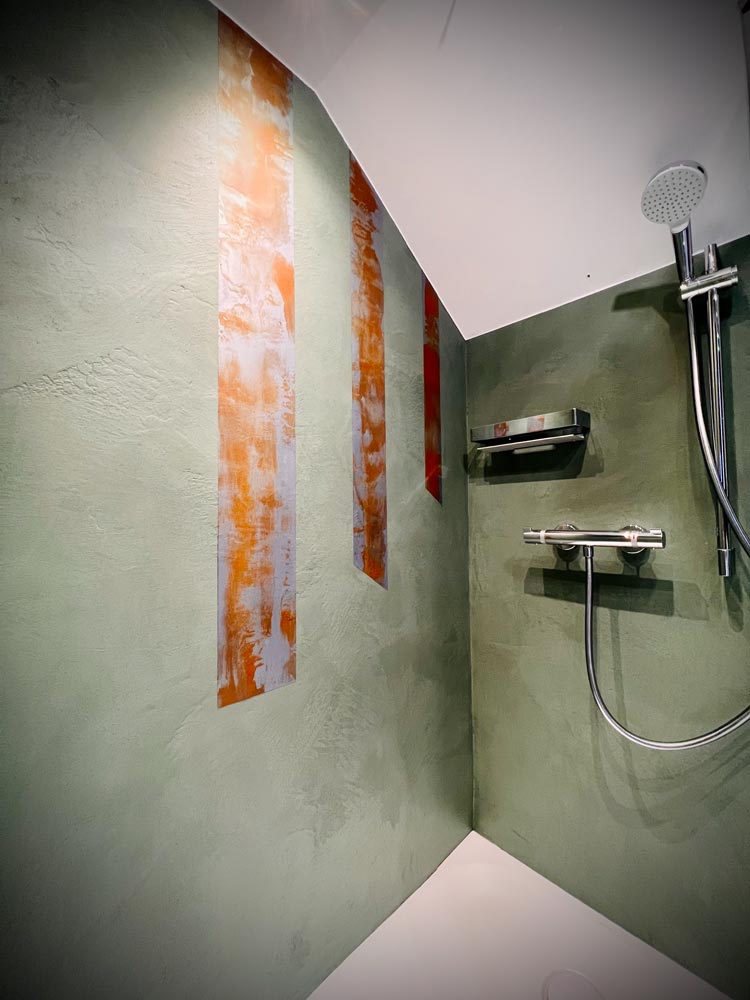 Die Betonimitation ist eine aufwändige Technik, die mit der Kelle von Hand aufgetragen wird. Das Objekt wird mindestens zweimal vollflächig mit einem speziellen Material überzogen. Nach der Trocknung wird es feucht abgeglättet. Danach wird alles fein aufpoliert. Die fertige Arbeit ist immer ein Unikat und auf die jeweiligen Geschmacksmuster