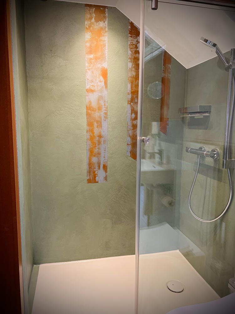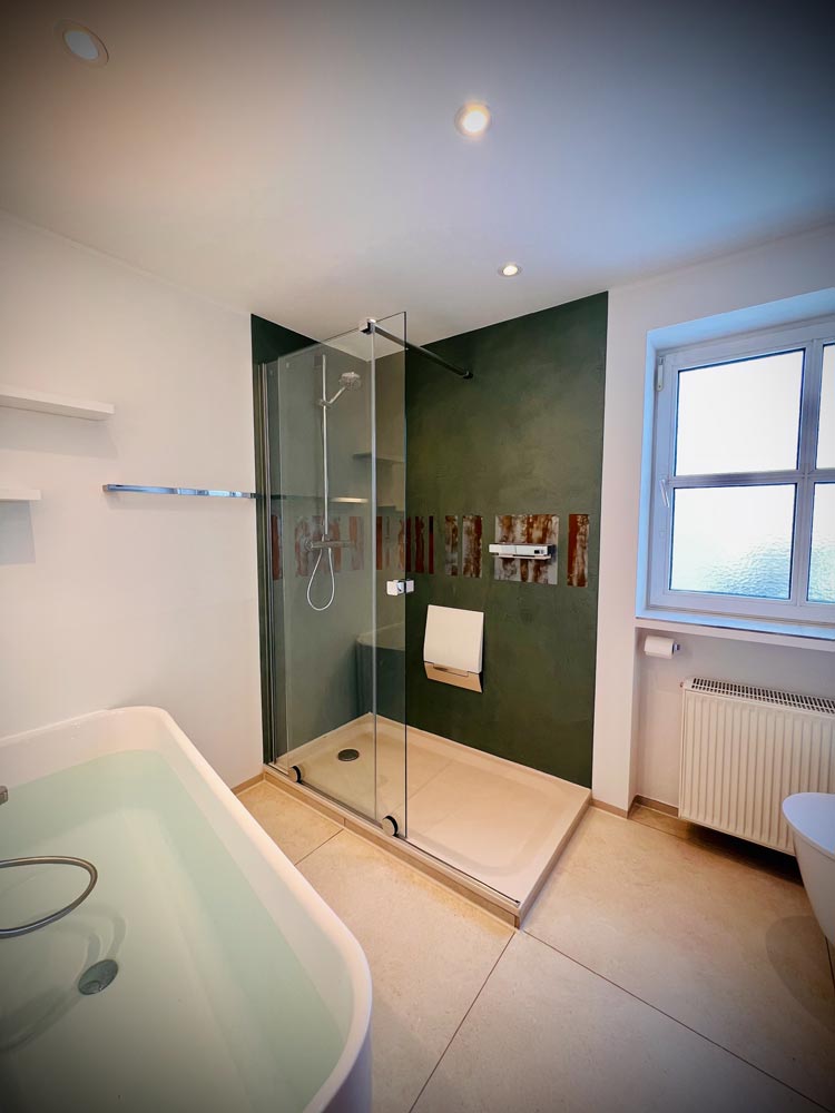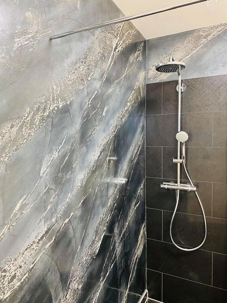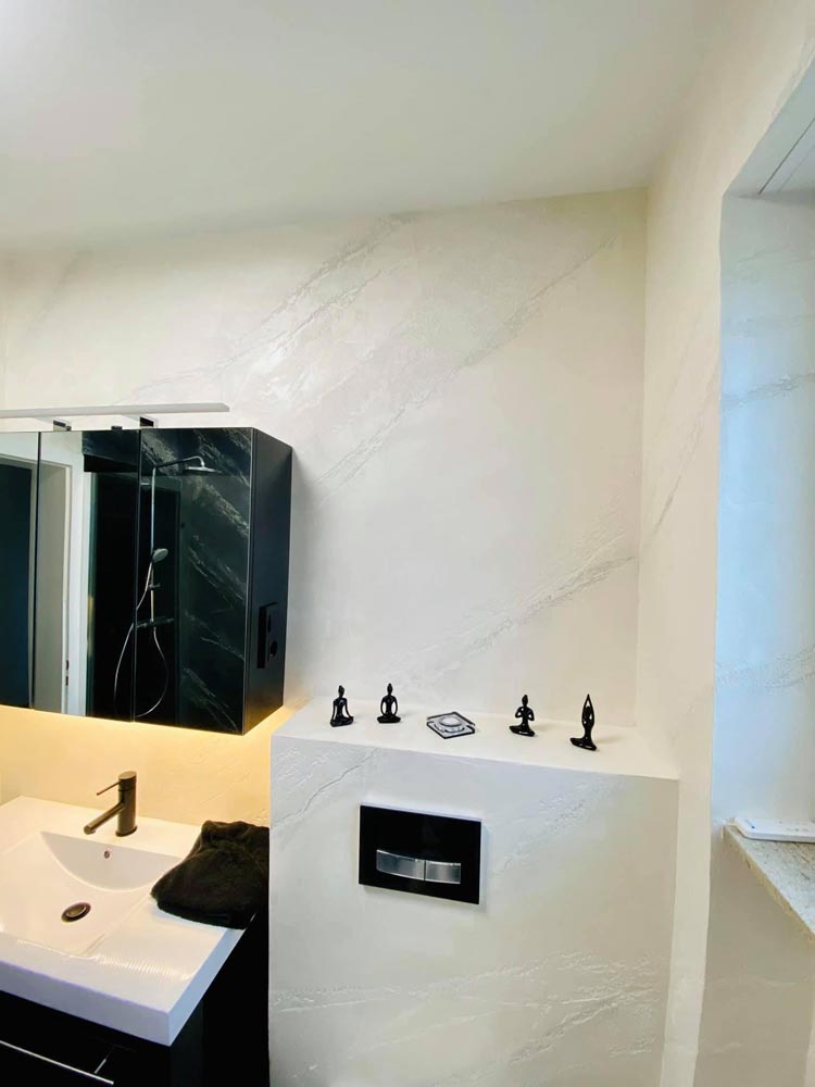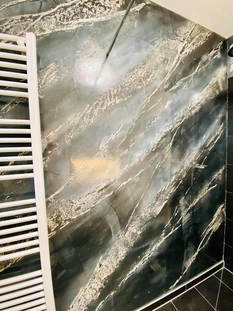 Die Marmorimitation ist sehr beliebt, da man sie überall einsetzten kann wo echter Marmor zu teuer oder zu schwer ist. Die Marmorimitation sieht aus wie echt und fühlt sich auch so an. Selbst ein Profi würde den Unterschied nur schwer erkennen. Diese Technik kann im Badbereich angewendet werden, da diese anschließend versiegelt wird und somit absolut wasserdicht ist. Will man große Wandflächen in Marmor, stören oft die unschönen Fugen. Dieses Problem haben wir bei der Marmorimitation nicht. Sie ist fugenfrei ausführbar.